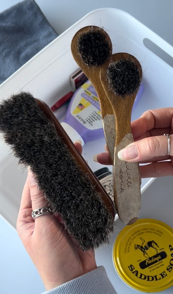 Horsehair bristles are soft yet effective so you don’t have to worry about scratching or damaging your bag. Buffing with a horsehair brush ensures even distribution of product and removes any excess product that could leave the leather sticky or dull. Amazon sells them in a pack of three—two small one large. I use one small one for lathering up saddle soap and the other two for buffing out Leather CPR and Blackrock. I labeled them with some painters tape.